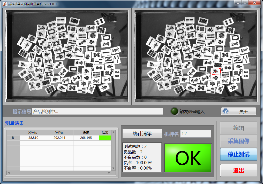 應(yīng)用于麻將生產(chǎn)流水線。通過(guò)CCD拍照,按要求識(shí)別不同的麻將圖案,將麻將坐標(biāo)角度信息發(fā)送給機(jī)械手,機(jī)械手拾取麻將,將麻將放到指定位置。