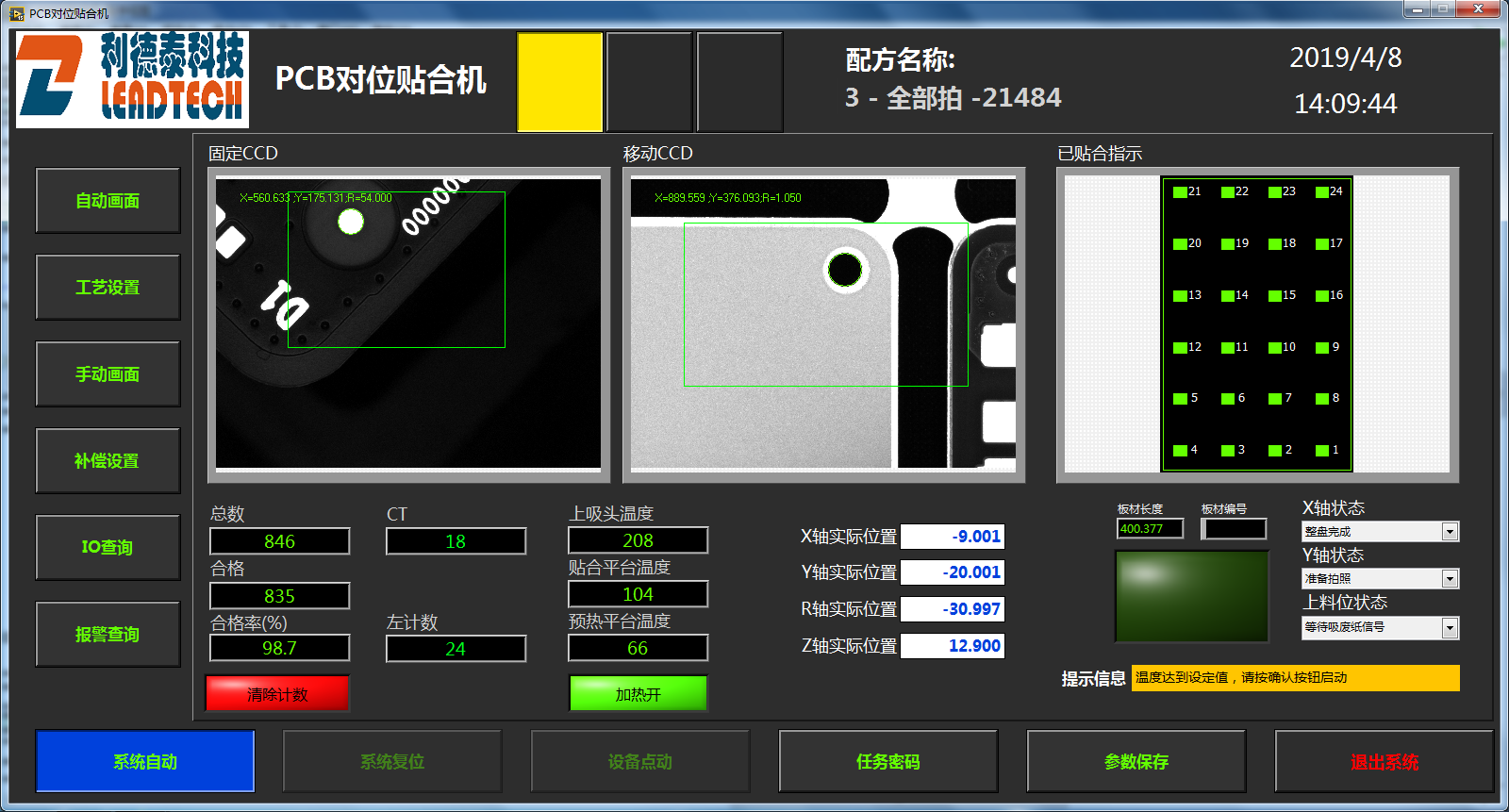 在PCB板生產(chǎn)行業(yè)中,需要對PCB貼合到基板上面,增加PCB板的強度。本系統(tǒng)使用2個200萬像素的CCD分別拍PCB板和基板上的2個MARK點,然后經(jīng)過標定算法運算,將PCB和基板貼合在一起,保證MARK點的貼合精度在±0.05mm以內(nèi)。本系統(tǒng)用到研華的8軸運動控制卡和IO卡對機臺伺服氣缸控制,將CCD檢測定位和機臺動作控制整合在一起,方便客戶使用和后續(xù)維護。