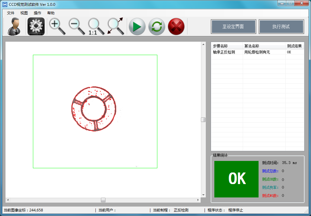 在風扇組裝設備中,在組裝風扇里面的零件前,需要檢測軸承的正反方向,確保零件按照統(tǒng)一方向組裝,以前客戶是安排一名員工人眼看,人工檢測容易疲勞,造成漏檢,而且也不適合自動化流水線的生產?,F(xiàn)在采用CCD拍照,對零件的特征進行測量,根據設定的產品相似度自動判斷零件是正面或者反面,給PLC信號進行旋轉零件。
